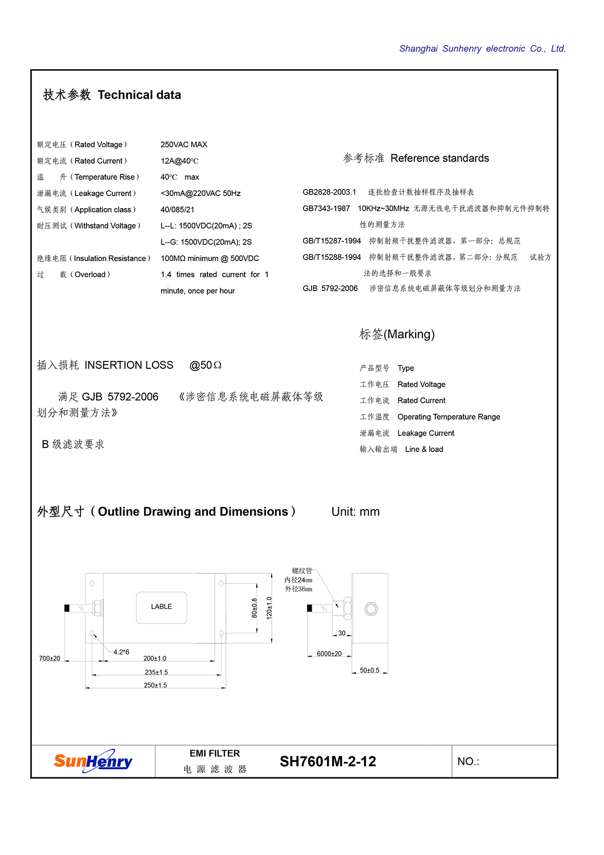 屏蔽体电源滤波器 SH7601M-2-12